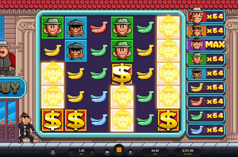Welcome to Banana Town, where gangster apes rule the reels! This pixel-styled 6×5 slot pays in clusters and features cascading wins, random symbol multipliers, and retro arcade vibes. Watch as bananas drop and wins explode with increasing multipliers. It’s chaotic, cool, and full of climbing prize potential. Ready to enter the jungle streets and spin your way to the top?