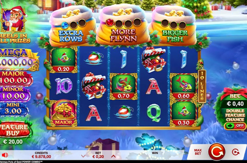 Ho Ho Ho! Get ready to cast your line for holiday treasures with Santa Flynn in Fishin’ Triple Christmas Pots of Gold™ POWER COMBO™! Join the Lucky Lad himself as he reels in Christmas cheer across the frosty North Pole! Flynn’s festive fishing trip is bursting with holiday prizes, including Pot of Gold Jackpots up to 5,000x your bet and glimmering cash symbols up to 25x. Collect shimmering ornament tokens to fill 3 mer...