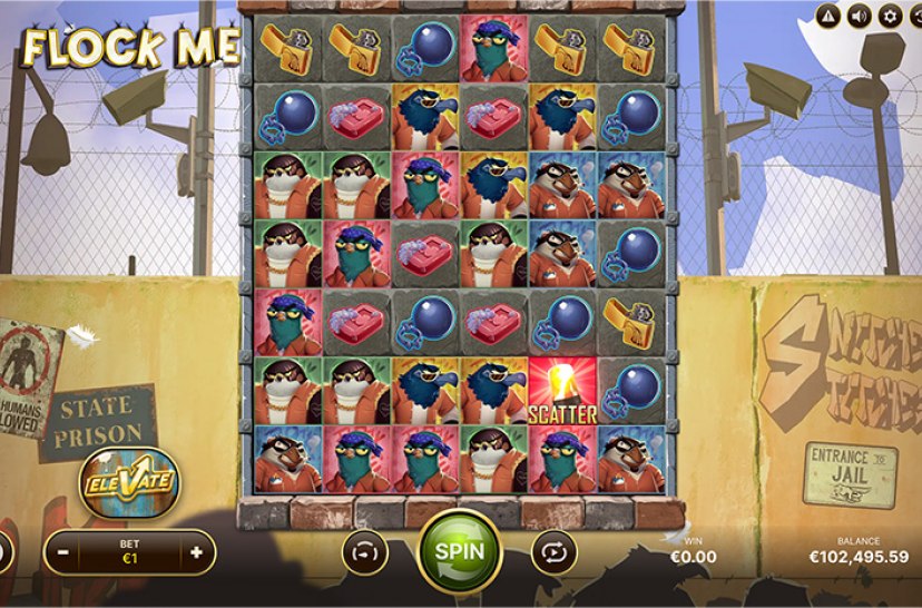 Break out of the coop in Flock Me by NetEnt! These gangster birds are behind bars, and wins hit when 5 or more symbols flock together. The Eagle Warden acts as a roaming Multiplier Wild, increasing in power with every win. Land 3 alarm Scatters to trigger Free Spins in the shower block, where stacked multipliers can soar sky-high.