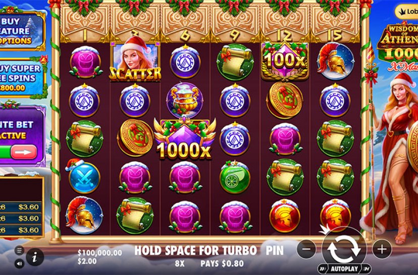 Snow falls over Mount Olympus in Wisdom of Athena 1000 Xmas, a festive 6×6 cluster slot where 8–15+ matching symbols award prizes. Consecutive tumbles unlock the top row before resetting each spin. Multipliers up to 1,000× can land anytime, combining when several appear. Four or more scatters trigger 10 Free Spins, where collected multipliers apply to every win for divine holiday rewards.