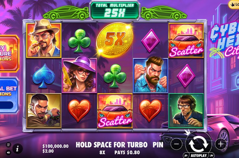 Rule the streets in Cyberheist City, a 5×3 pays-anywhere slot driven by futuristic crew members. Gold symbols can appear on reels 2–4, transforming into Wilds on winning tumbles. Each cascade increases the multiplier by +1x, stacking tension and reward until the spin resets in this high-energy urban heist.